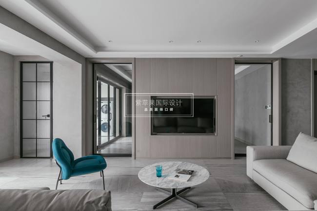 設(shè)計(jì)師在墻面藝術(shù)漆、地面地磚、地板、柜體、家具在材質(zhì)上選擇啞光的質(zhì)感,大面積低飽和度的色調(diào),都在呼應(yīng)整體柔和的氣氛。在整體大面積灰白調(diào)子的鋪陳下,讓人成為空間的主體。 客廳、餐廳、西廚關(guān)聯(lián)起整個(gè)公共區(qū)域,有著豐富的視覺景深和多路線的現(xiàn)代生活情境。寬裕的活動(dòng)空間體現(xiàn)了了大平層的空間優(yōu)點(diǎn)。與客廳空間可開可合的書房,局部的藍(lán)色柜體提亮了整體空間,體現(xiàn)年輕人的活力。